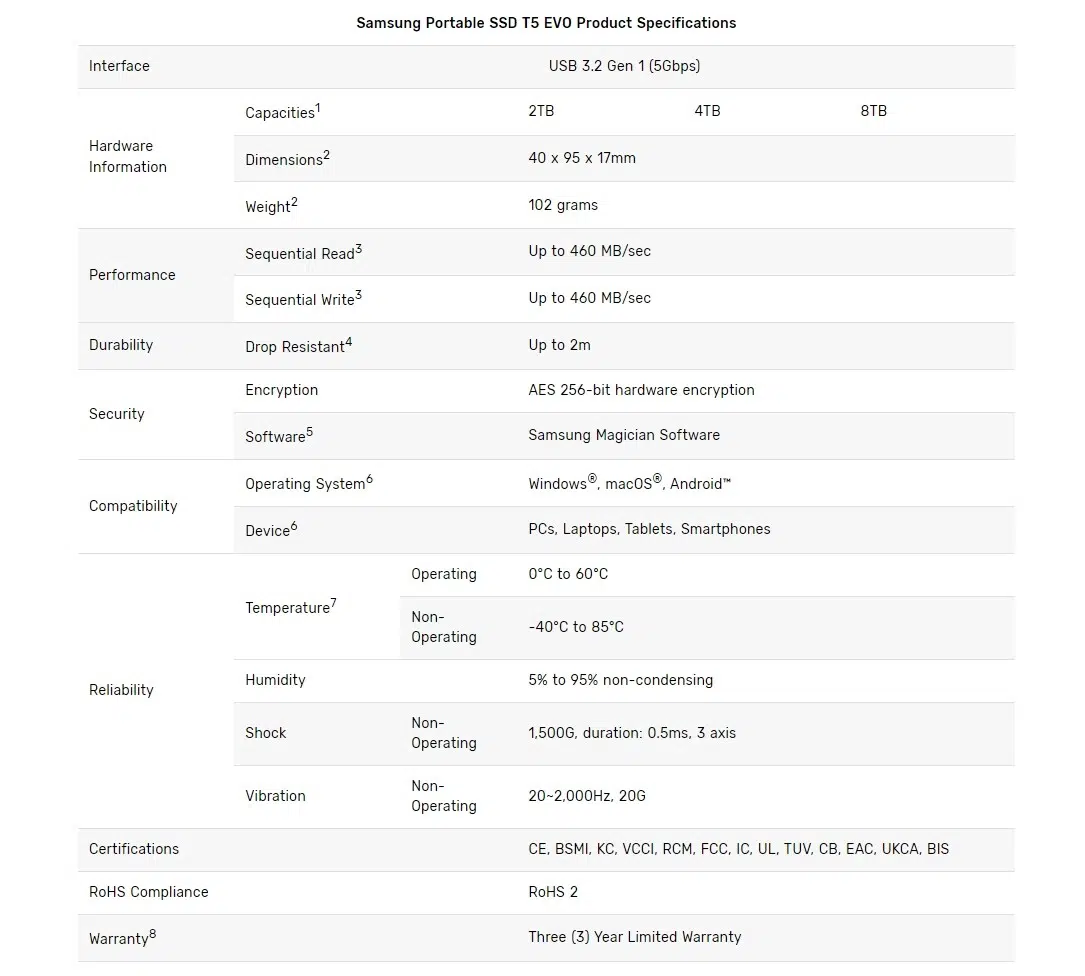 Гарантия производителя — 3 года. Стоимость T5 EVO на 2 ТБ составляет $189,99, версию объёмом 4 ТБ оценили в $349,99, а вариант на 8 ТБ — $649,99.