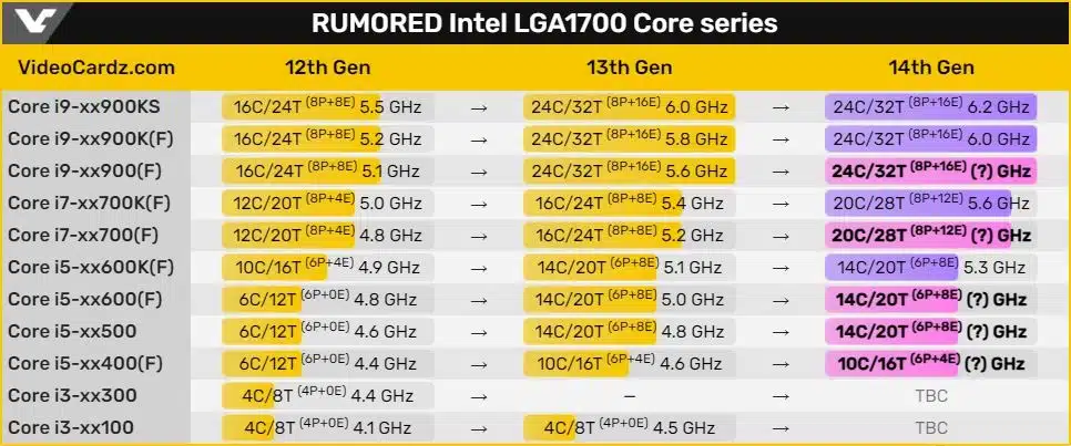 Core i7-14700 получит 20 ядер, как и 14700K, что станет самым крупным обновлением в этой линейке. В i5-14400 ожидается шесть производительных ядер и четыре экономичных, как и у предшественника.