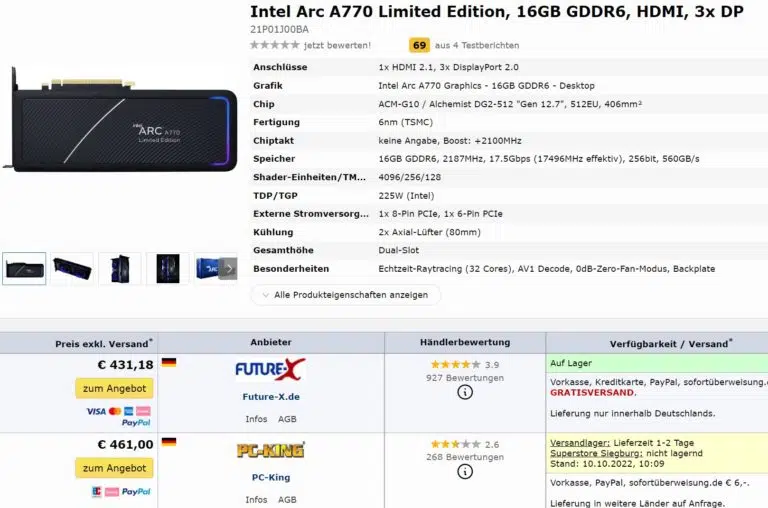 Согласно данным с европейского сайта сравнения цен, самая дешёвая модель видеокарты Intel Arc A770 Limited Edition предлагается по цене 430 евро. Дискретные видеокарты Intel Arc A7 для ПК уже были протестированы обозревателями из СМИ, но Intel до сих пор не называла официальных цен. Известно, что A770 Limited Edition с 16 ГБ видеопамяти будет стоить $349 в крупных розничных магазинах США.