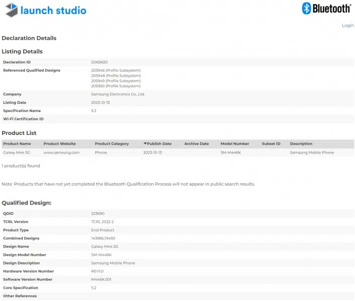 В листинге Launch Studio указано, что смартфон указан под номером SM-M446K и поддерживает Bluetooth 5.2, но ничего другого о нём не сообщается.