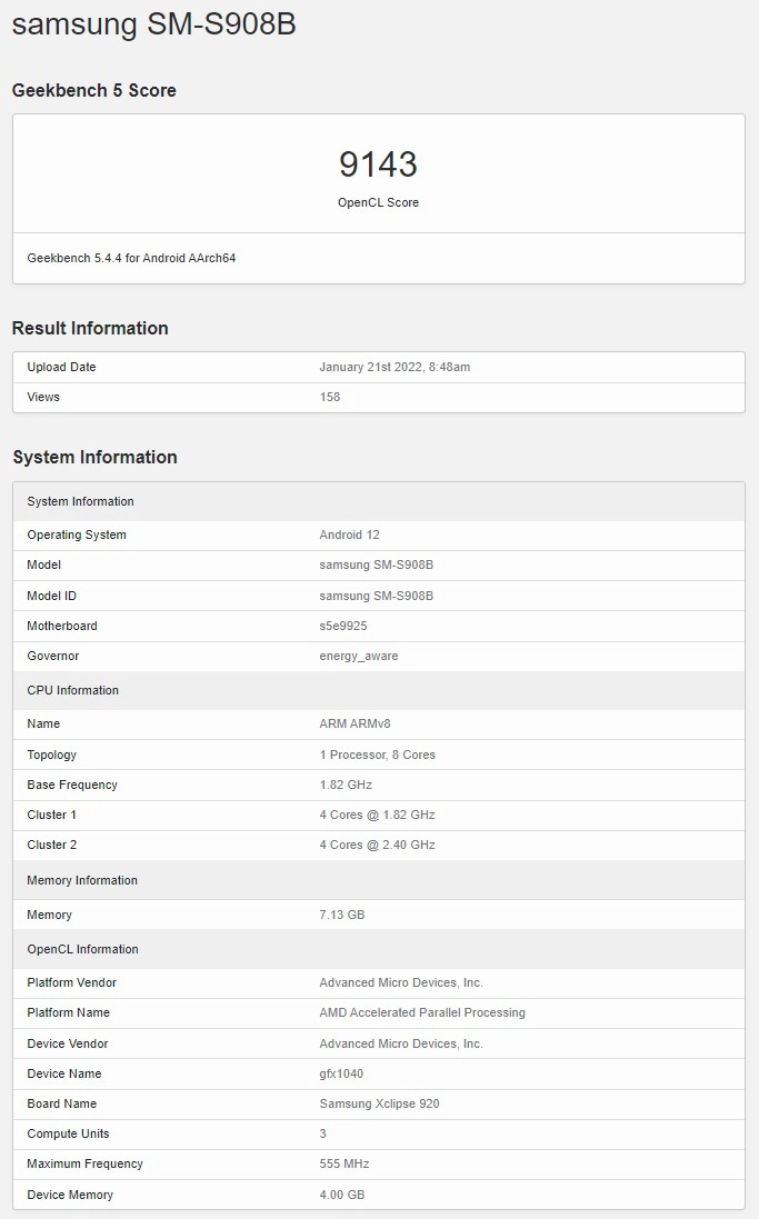 Там рассмотрели мобильное устройство Samsung с номером SM-S908B на Android 12 с 8 ГБ памяти. Snapdragon 8 Gen 1 был в составе смартфона Motorola XT2201-2. Как видно из результатов, чип Samsung заметно опережает Snapdragon 8 Gen 1. Тест OpenCL показывает наличие видеопамяти 4 ГБ. Неизвестно, это выделенная память (VRAM) или DRAM. GPU в Xclipse 920 работал на частоте 555 МГц. Это очень мало, поскольку прежде ждали значения 1,30 ГГц.
