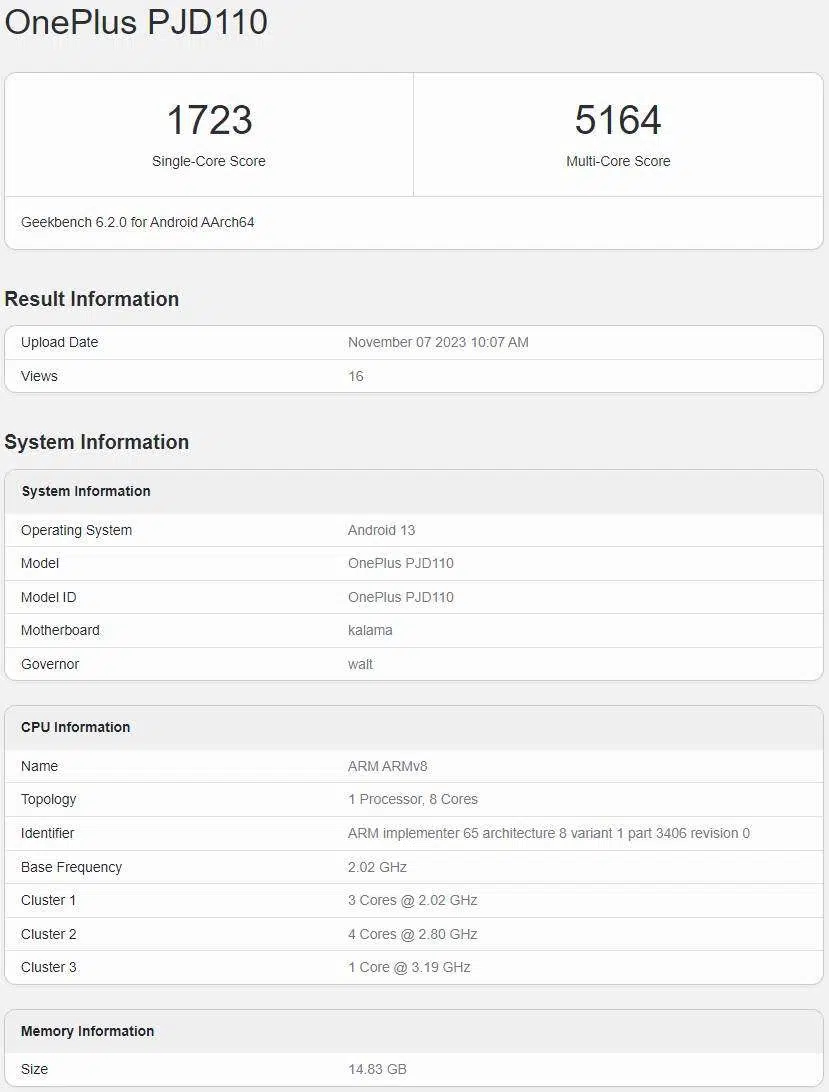 Телефон под номером PJD110 имеет чипсет Snapdragon 8 Gen 2, 16 ГБ оперативной памяти и ОС Android 13. По слухам, анонс этого устройства может состояться в Китае в первом квартале 2024 года. Ожидается, что он будет оснащён 6,74-дюймовым OLED-дисплеем на 120 Гц с разрешением 1240 x 2772 пикселей с пиковой яркостью 2 600 нит. Глобальную версию могут переименовать в OnePlus 12R.