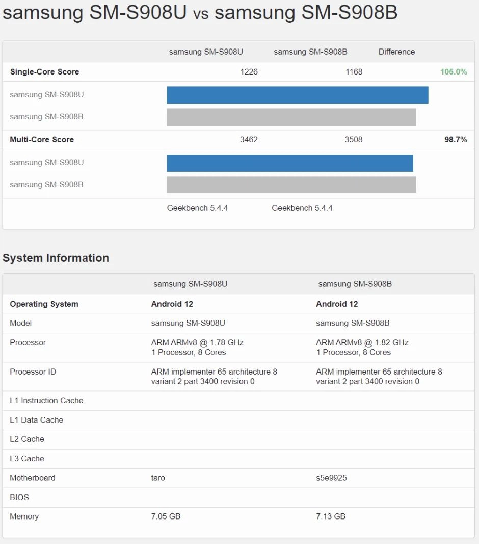 В базе данных бенчмарка Geekbench 5 появилась модель SM-S908B. Это международный вариант смартфона S22 Ultra на Exynos 2200, который будет продаваться и в России. Результаты тестов можно сравнить с SM-S908U (S22 Ultra на Snapdragon).