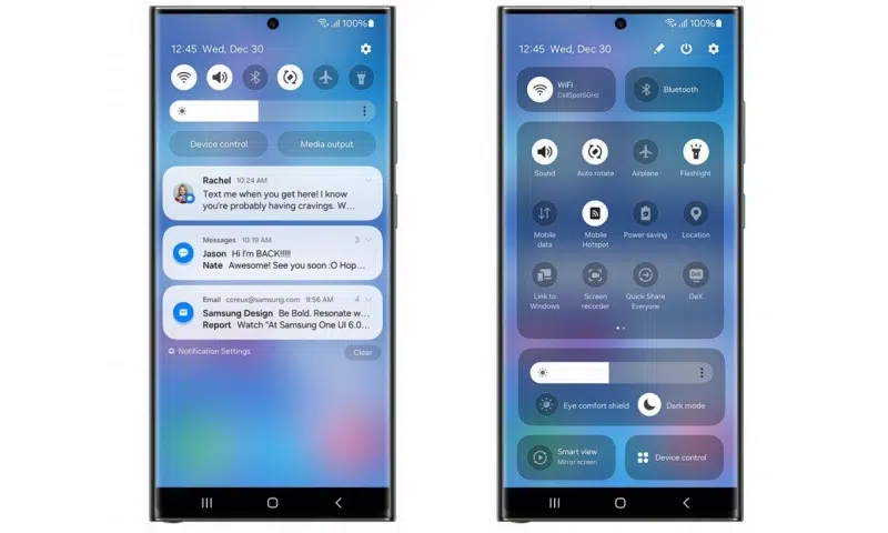 One UI 6 получила обновлённый дизайн интерфейса быстрого доступа и нового виджета камеры, шрифты, улучшенную конфиденциальность, изменённый экран блокировки, и функцию изменения обоев для разных режимов.