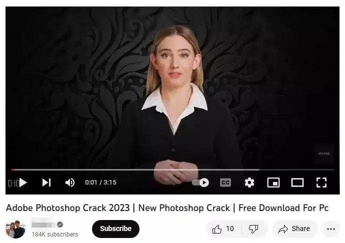 В видеоролике пользователей заманивают обещаниями дать полные инструкции по скачиванию взломанных игр и лицензионных приложений вроде Photoshop, Premiere Pro, Autodesk 3ds Max и AutoCAD. В прежние времена такие видео были простыми и состояли из надписей на экране или звукового ряда. Теперь же создавать подобные видеоролики помогает искусственный интеллект на платформах вроде Synthesia и D-ID. Это увеличивает достоверность видео и содержащейся в них информации в глазах пользователей.