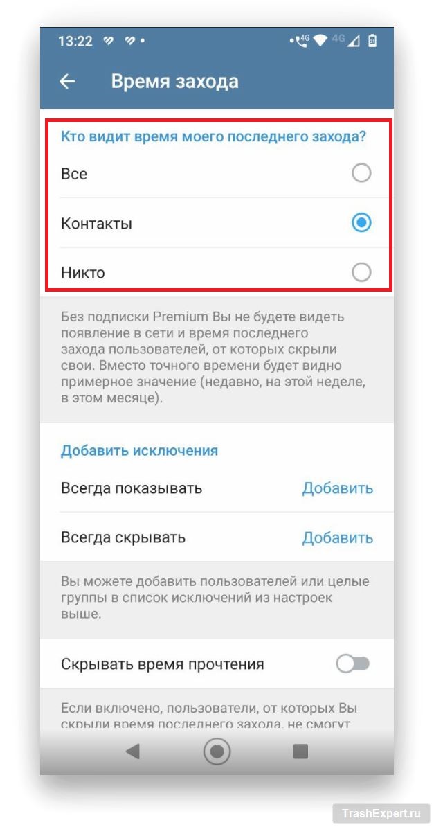 - (Опционально) Добавьте исключения для тех, кому вы хотите показывать точное время входа, в разделе «Добавить исключения».