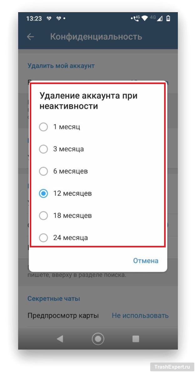 - Выберите период бездействия (например, 1 месяц), после которого аккаунт будет автоматически удалён.