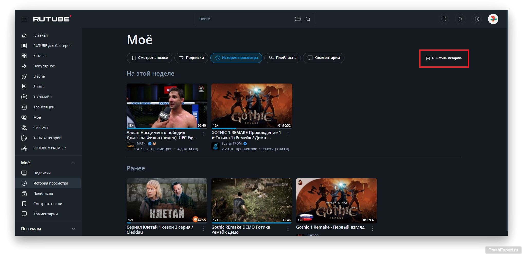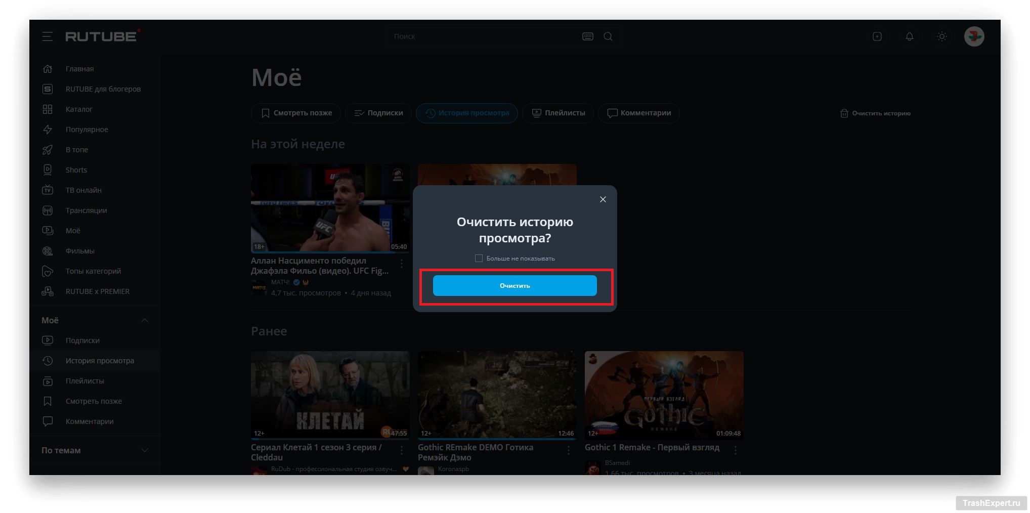 Вариант 1: Очистка истории на десктопной версии RuTube