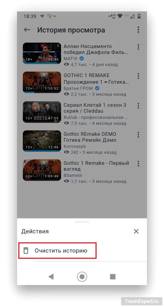- Для выборочного удаления кликните на три точки рядом с видео и выберите «Удалить из истории». Подтверждение не требуется.